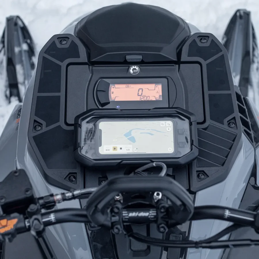 Levy mahdollistaa Cellphone Holderin (860202372) kiinnittämisen ja on suunniteltu yhteensopivaksi 4,5” digitaalinäytön kanssa. Kestävä rakenne ja tarkasti mitoitettu asennus takaavat tukevan ja siistin lopputuloksen, joka integroituu täydellisesti kelkan ohjaamoon.